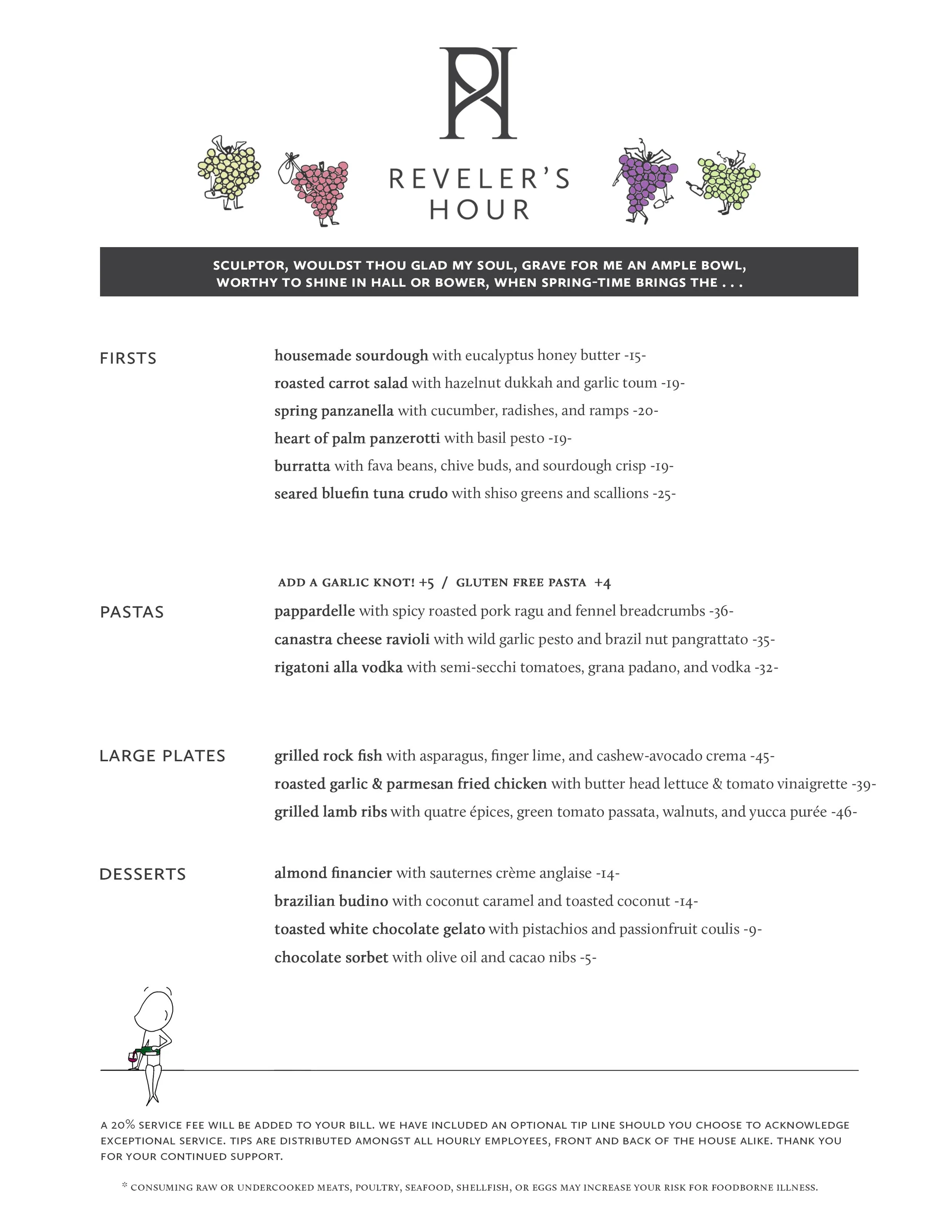Our menu is hyper-seasonal and always evolving. We update it regularly, but individual items may change daily. Please reach out to us directly to confirm availability if you have your heart set on anything in particular.